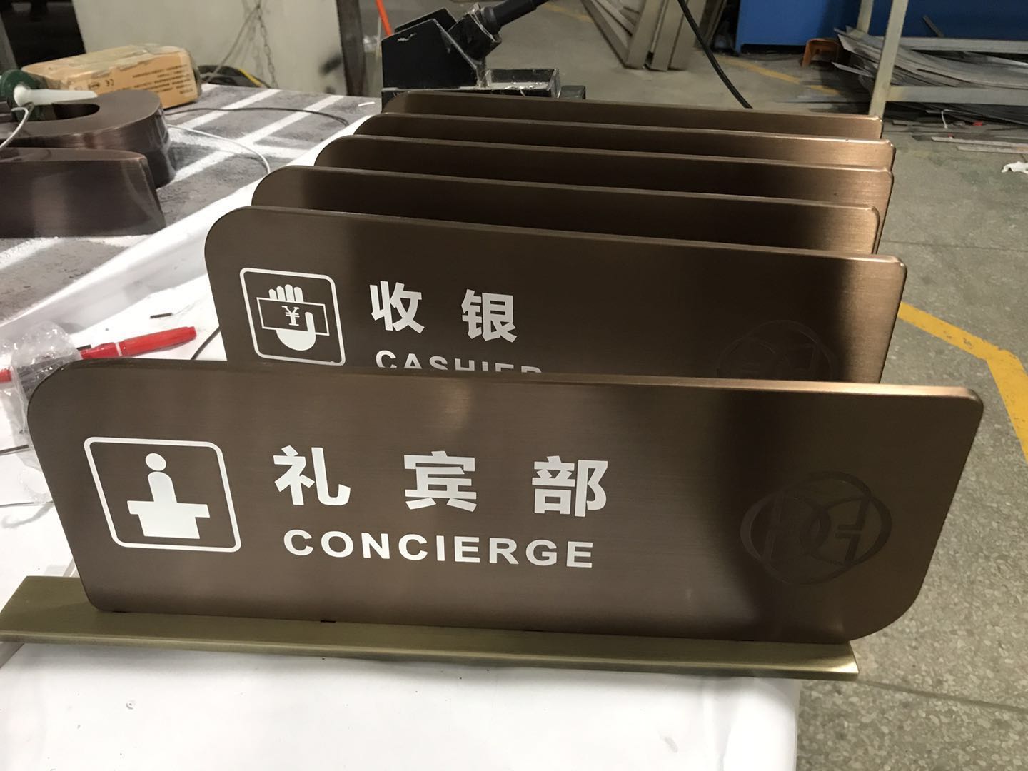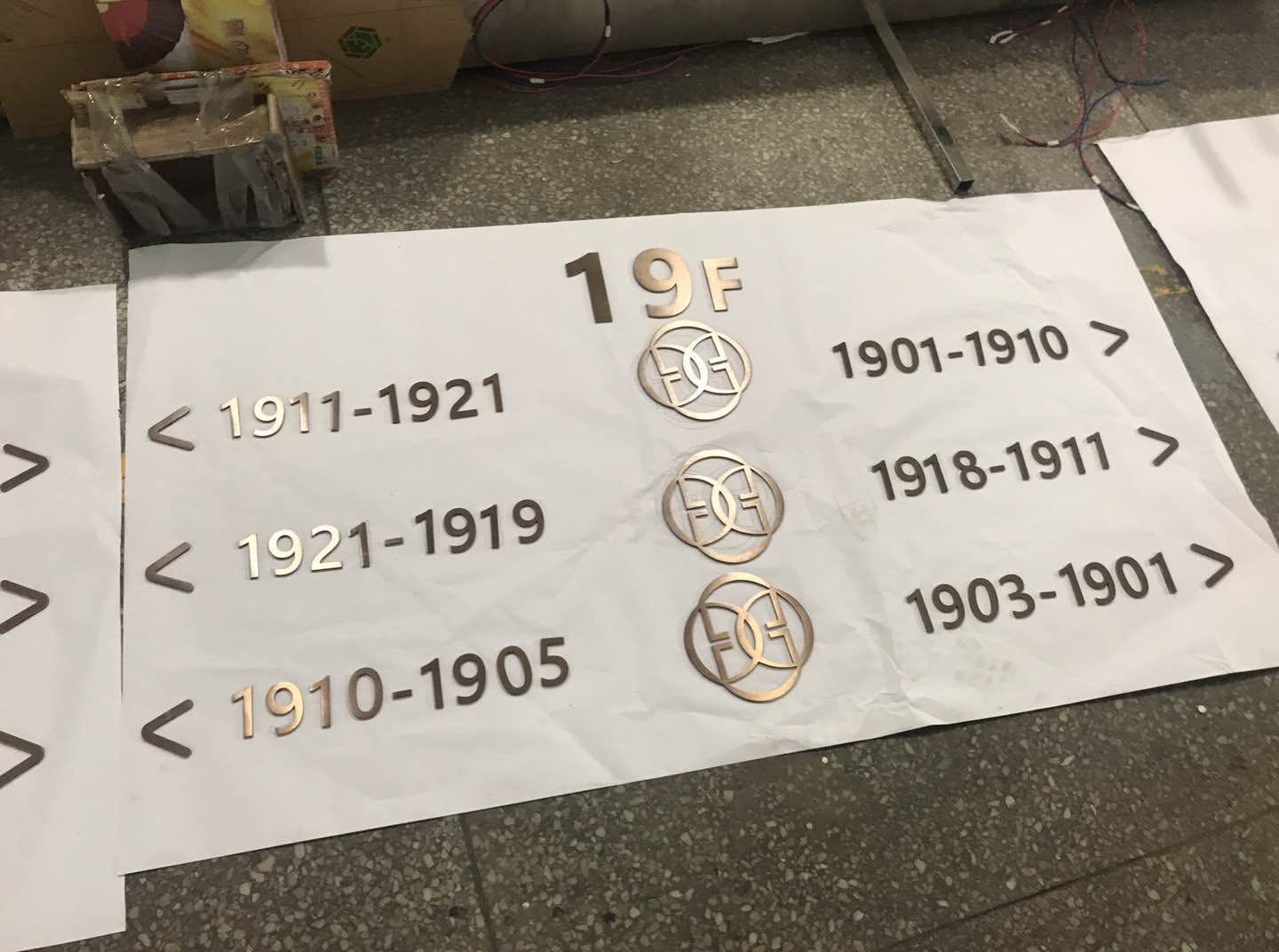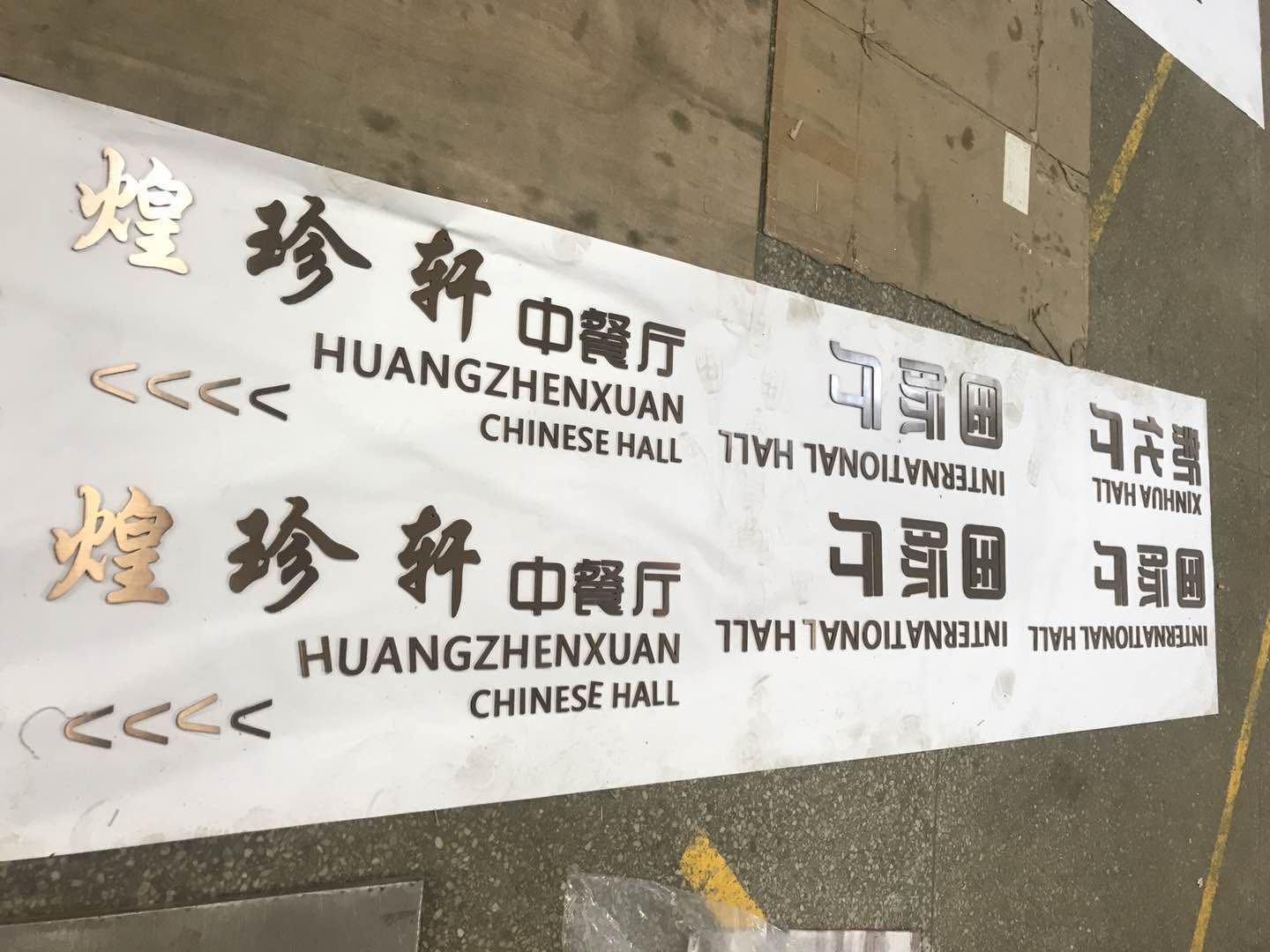 本套酒店標識制作主要以不銹鋼為主,以5mm拉絲不銹鋼切割電鍍仿古銅色立體字,及不銹鋼焊機造型,腐蝕填漆、電鍍工藝為主要工序。