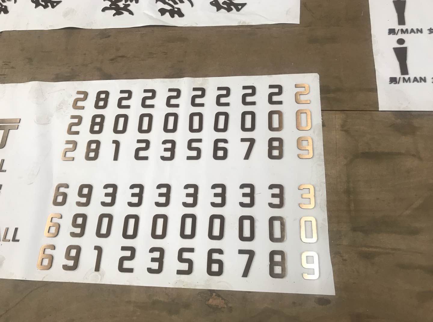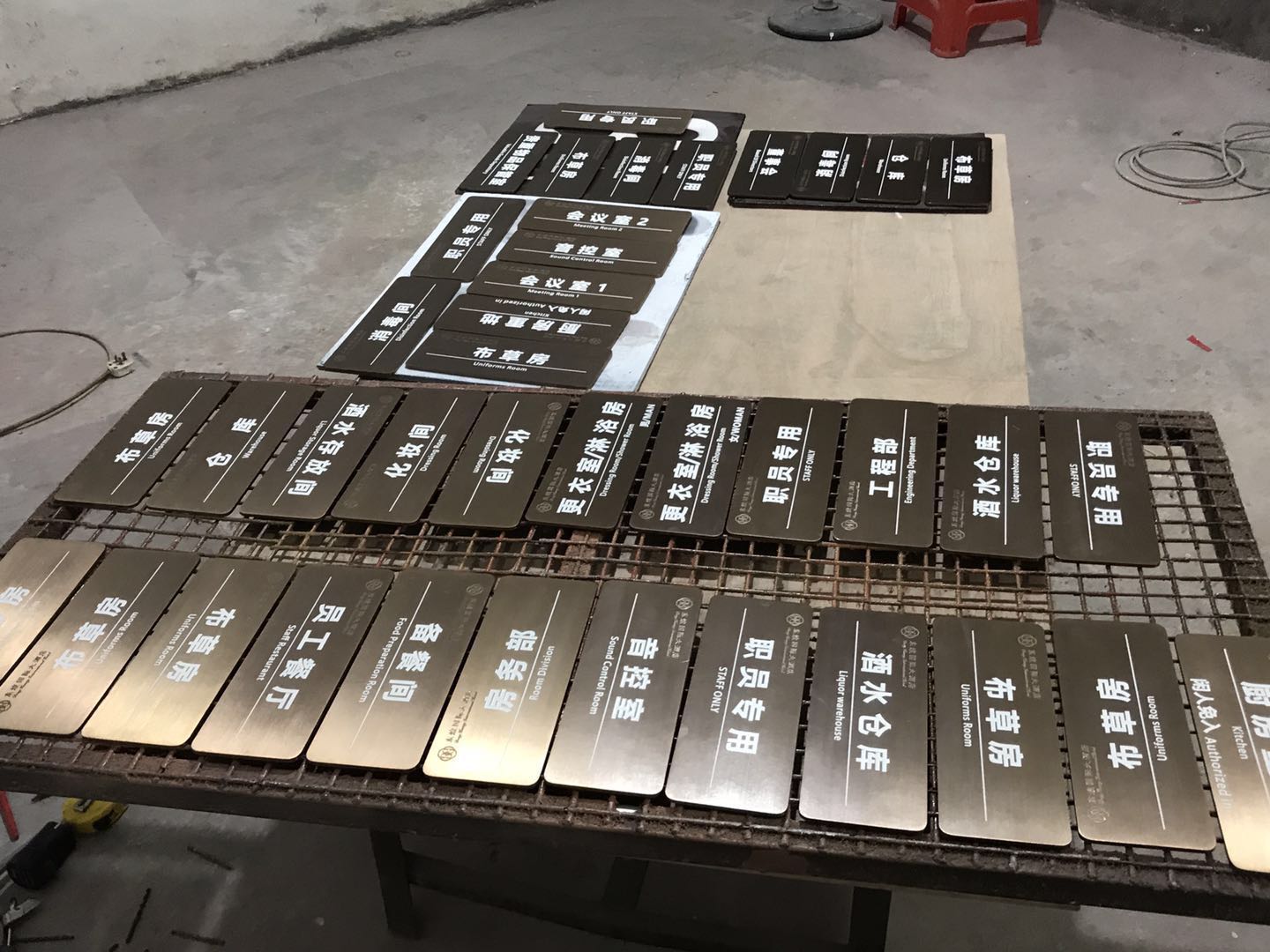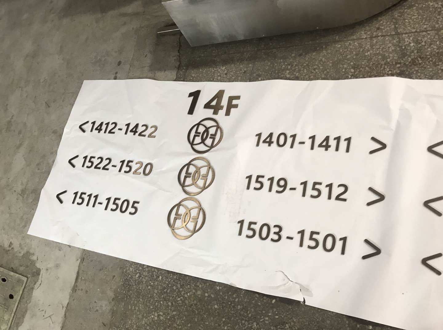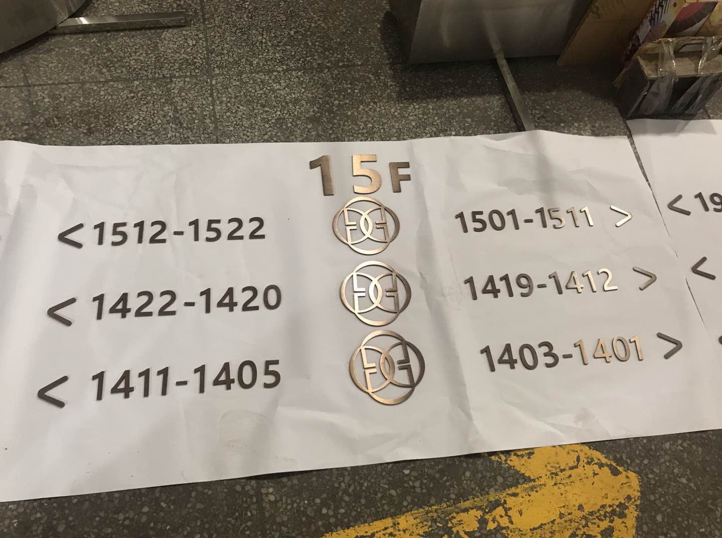 本套酒店標識制作主要以不銹鋼為主,以5mm拉絲不銹鋼切割電鍍仿古銅色立體字,及不銹鋼焊機造型,腐蝕填漆、電鍍工藝為主要工序。
